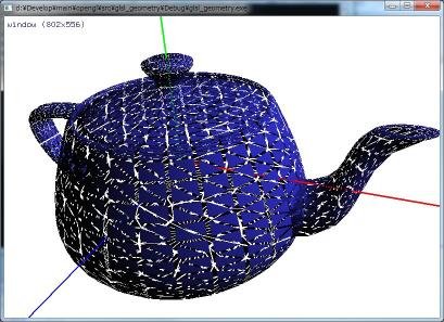 GLSLを用いて単純なジオメトリシェーダを用いたプログラムを実装する. ジオメトリシェーダとは†ジオメトリシェーダはバーテックスシェーダとフラグメントシェーダの間に位置するシェーダである. バーテックスシェーダは頂点ごとの処理,フラグメントシェーダはフラグメント(ピクセル)ごとの処理であり, この二つだけでは,例えば,入力された三角形ポリゴンから点群を生成して描画する, ポリゴンのテッセレーション,ディスプレースメントマップなどの処理は難しい. これらの処理のためにはプリミティブごとの処理を行い,かつ,新しいプリミティブを作り出すことができるシェーダが必要である. これがジオメトリシェーダである. 例えば,ポリゴンのテッセレーションを行いたい場合,1ポリゴンをプリミティブとして入力とし, ジオメトリシェーダ内で新しい複数のポリゴンを生成して出力することで処理を実現できる. このとき,ジオメトリシェーダへの入力,出力はポリゴンとなる. また,ポリゴンから点群を生成したい場合,1ポリゴンをプリミティブとして入力して, ジオメトリシェーダ内で新しい点群を生成して出力する. このときの入力はポリゴンで出力は点となる. このように,ジオメトリシェーダを用いる場合,その入力と出力プリミティブが場合によって異なるため, シェーダプログラムのパラメータとして入力,出力を設定しなければならない. ジオメトリシェーダのビルド†GLSLについてで述べているように,シェーダのビルドを行う必要がある. ジオメトリシェーダのコンパイルは,targetにGL_GEOMETRY_SHADERを渡すこと以外は, 他のシェーダ(頂点シェーダ,フラグメントシェーダ)と同じであるので,GLSLについてを参照してほしい. 他のシェーダとビルドにおいて異なるのがシェーダへの入出力の設定で, これはシェーダオブジェクト登録(glAttachShader)とプログラムのリンク(glLinkProgram)の間で行う. 入出力設定にはglProgramParameterを用いる. void glProgramParameteri(GLuint program, GLenum pname, GLint value); programにglCreateProgramで作ったプログラムオブジェクト,pname,valueにパラメータと値を設定する.パラメータと値は,